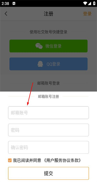 进入注册界面后,能看到社交账号快捷登录和邮箱注册两种选项,按要求填写邮箱、密码等相关信息,再点击提交按钮,即可完成注册流程。