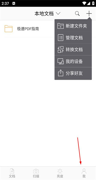 打开软件后,首页设有极速PDF指南以及新建文件夹等功能选项,点击“我”按钮即可进入对应的个人中心页面。
