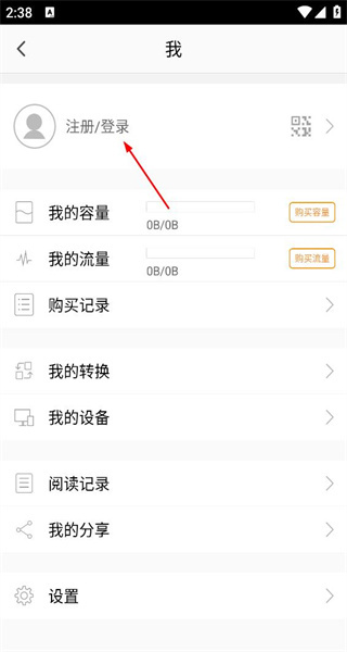 进入个人中心页面后,能看到注册登录、我的容量、我的流量等选项,点击“注册登录”即可进入对应的登录操作页面。