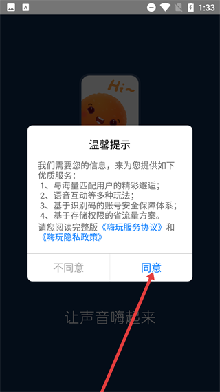 在温馨提示弹窗内仔细阅读《嗨玩服务协议》与《嗨玩隐私政策》后,点击【同意】按钮,即可进入“嗨玩”的后续操作流程。