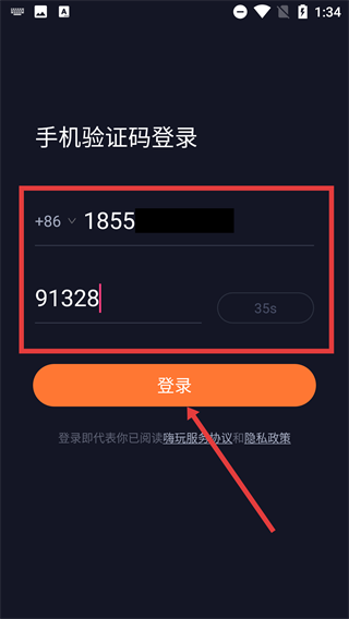 在手机验证码登录界面输入手机号和验证码后,点击【登录】按钮,即可完成“嗨玩”账号的登录流程。