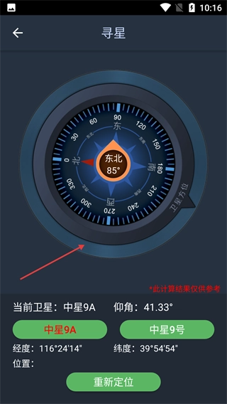 进入【寻星】页面后,能查看卫星的方位信息(例如东北-85°),选定【中星9A】这类卫星,再点击【重新定位】按钮,即可获取精准的卫星数据。