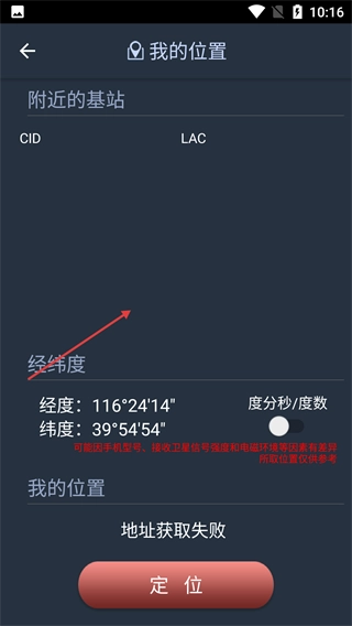 进入【我的位置】页面,就能查看经纬度信息。要是页面显示【地址获取失败】,点击【定位】按钮重新获取位置即可。
