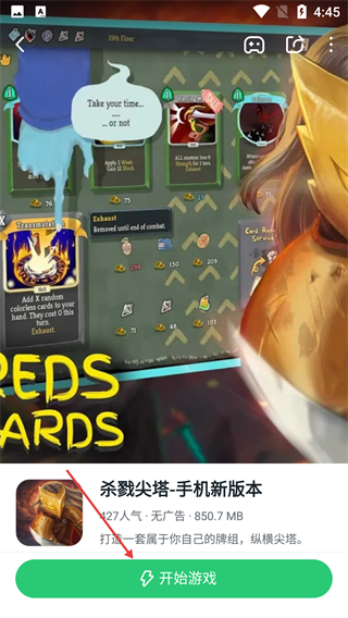 在“杀戮尖塔-手机新版本”的详情页面中,点击【开始游戏】按钮,就能进入游戏的游玩界面。