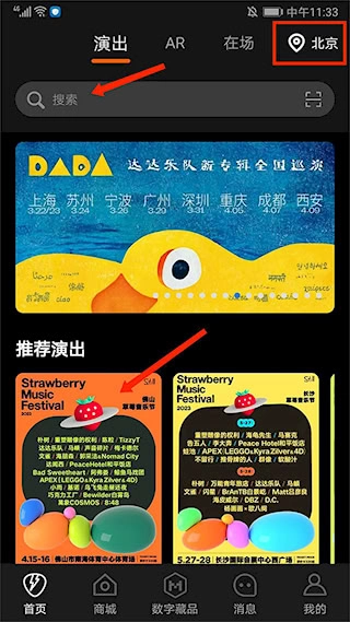 打开摩登天空售票平台的手机端应用,进入主界面后,点击右上角的城市选择按钮。你可以通过搜索框输入具体的演出名称来查找,也能滑动屏幕浏览平台推荐的演出内容,这里我们以佛山地区为例进行说明。