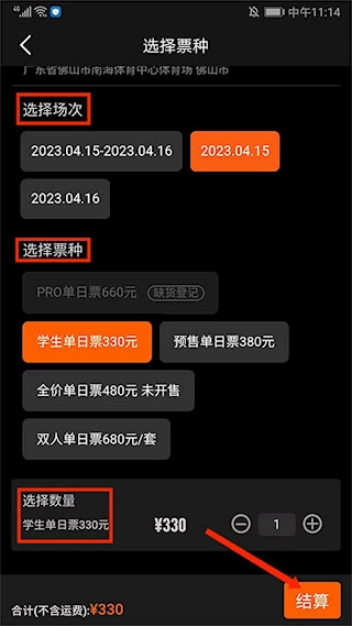 在【票种选择】页面,根据自身需求挑选场次、票种并确定数量,比如选择4.15学生单日票,选好后点击【结算】按钮。