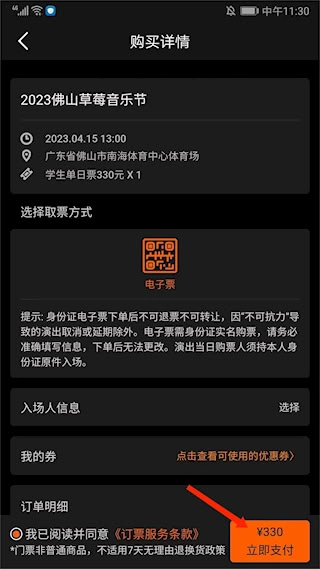 在【购买确认】页面,仔细核对音乐节的相关信息,挑选合适的取票方式,接着点击【立即支付】按钮并完成支付流程,这样就能顺利买到学生票了。