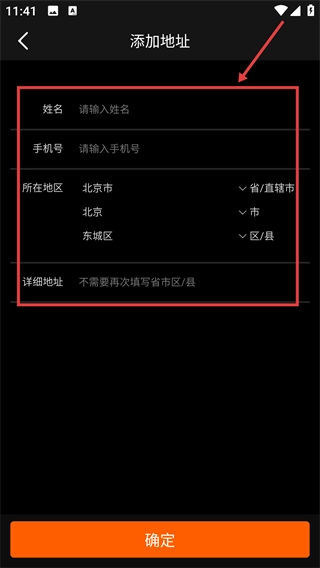 请按顺序填写姓名、手机号码、所在地区和详细地址,完成收货地址的信息录入。