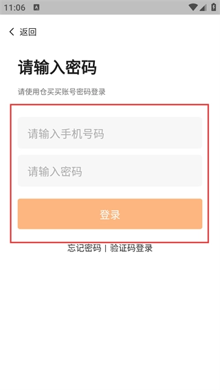 选择账号密码登录的方式后,依次填写【请输入手机号码】和【请输入密码】这两个字段,最后点击【登录】按钮,就能完成该登录方式的操作流程。