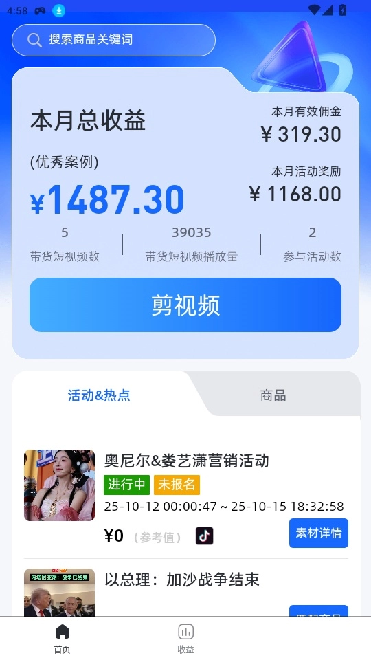 还能够迅速筛选各类高佣金的商品素材,剪辑成带货视频并发布。