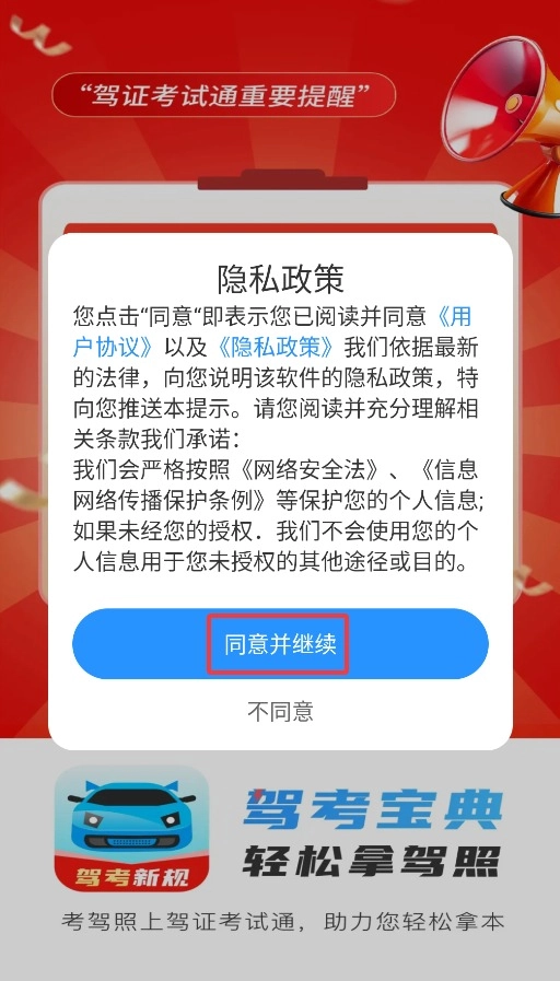 1、首次启动驾证宝典王应用时,需先点击同意用户协议弹窗,之后才能进入主界面开始使用。