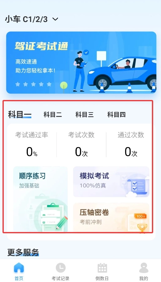 2、首页支持科目一至科目四的学习选择,并提供顺序练习、模拟考试等备考功能。