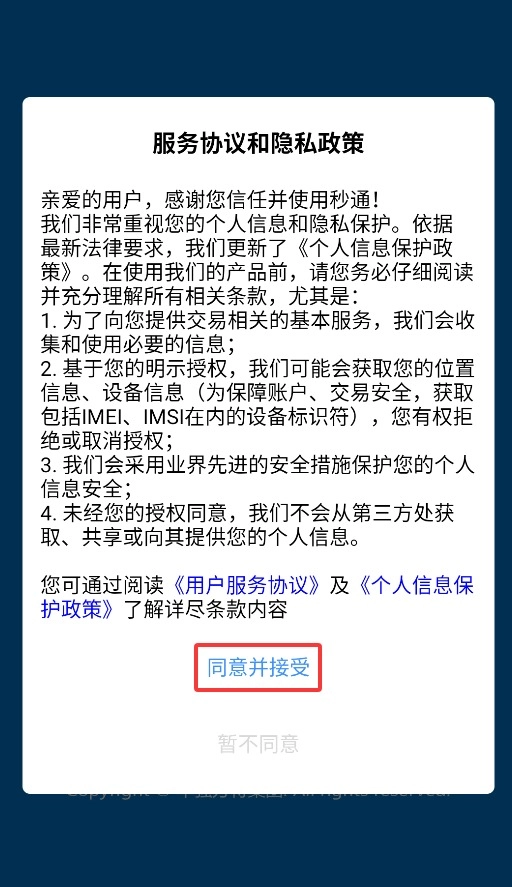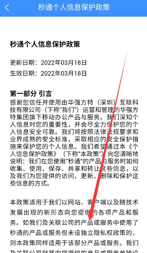 2、请向下滑动页面,仔细阅读并同意秒通个人信息保护政策的相关内容。