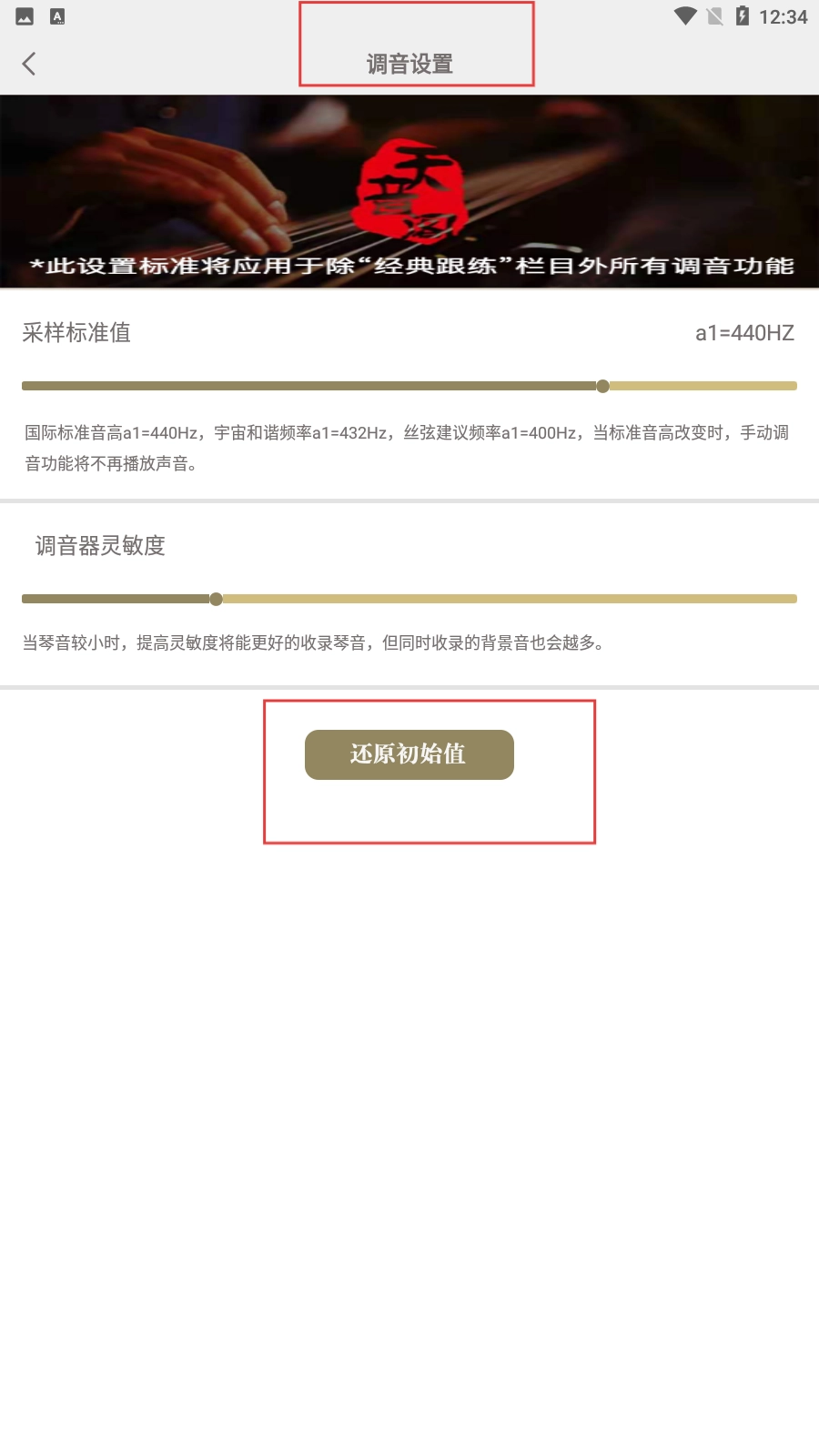 4、进入调音设置界面,能对采样标准值和调音器灵敏度进行调整,也可以点击【还原初始值】功能按钮来恢复默认设置。