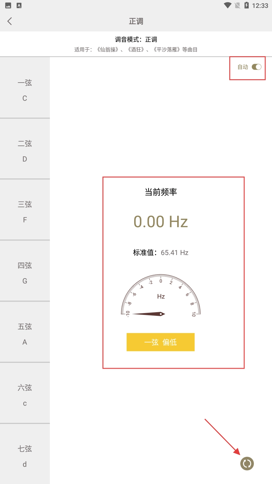 3、进入正调页面后,能够查看每根弦的频率数值,点击自动开关与刷新按钮即可完成相应操作。