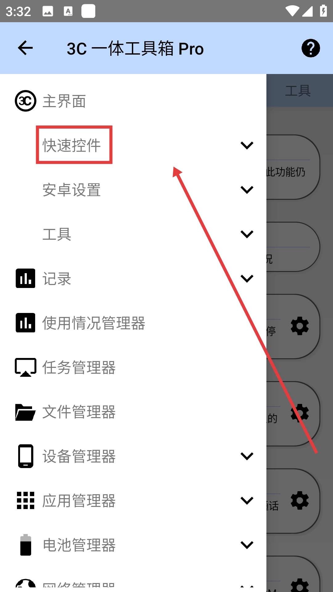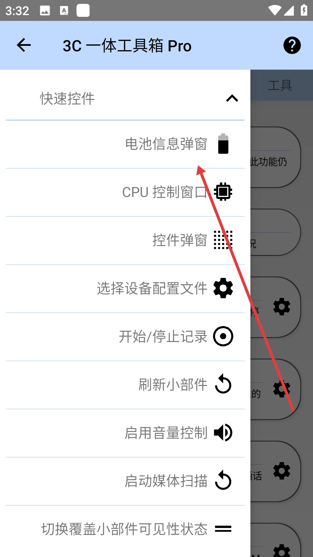 2、在功能列表里点击【快速控件】,随即展开它下面的电池信息弹窗、CPU控制窗口等功能选项。