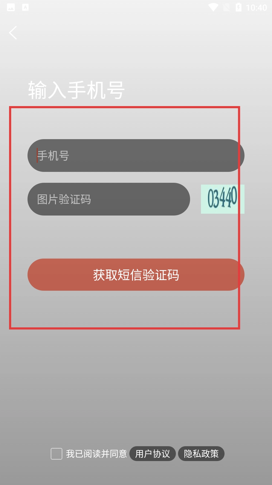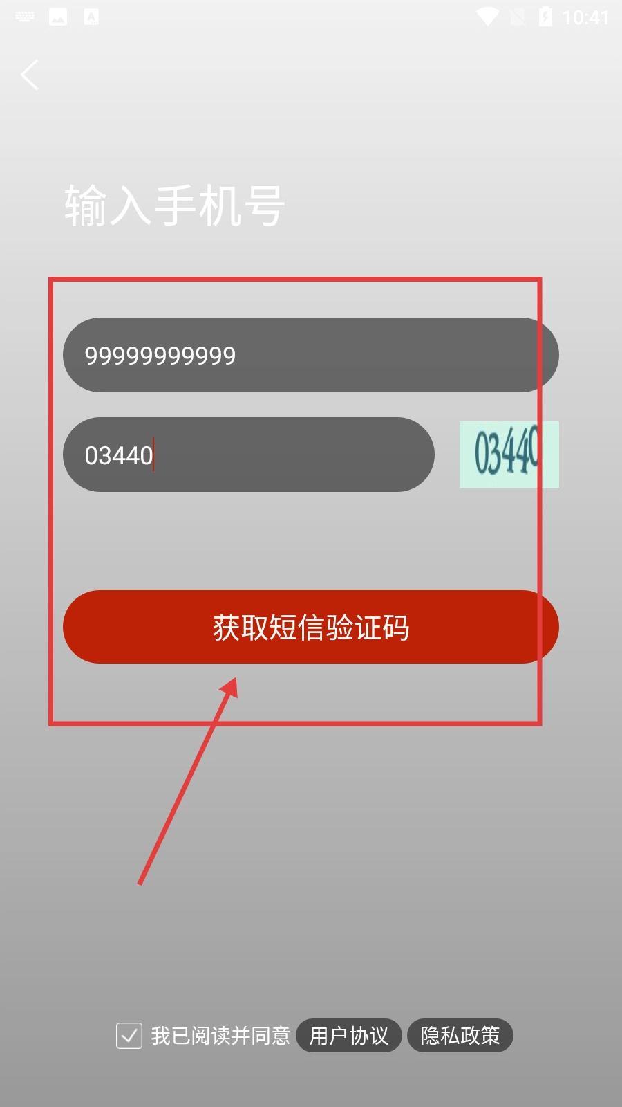 在注册页面,需要填写手机号并输入图片验证码,勾选同意用户协议与隐私政策后,点击【获取短信验证码】按钮。