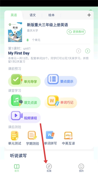 进入英语学习页面后,点击底部的【拓展】选项,即可进入拓展板块,在该板块中能够查看锻炼身体、知识拓展等相关功能。