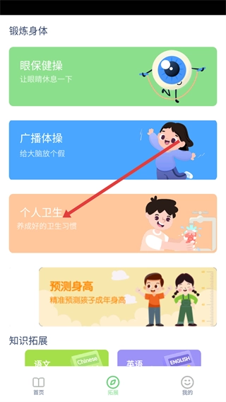2、在拓展板块中,点击【个人卫生】选项,即可进入个人卫生学习页面,进而了解卫生习惯的相关内容。