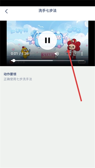 4、进入洗手七步法视频播放页面后,就能观看视频学习正确的洗手动作,从而掌握七步洗手法的动作要领。
