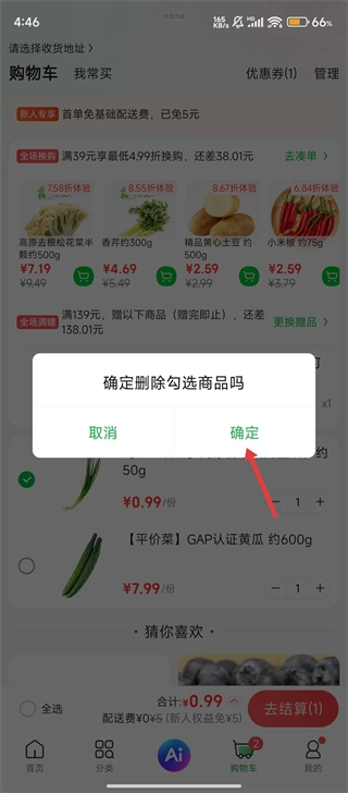 4、在弹出的确认窗口里,点击【确定】按钮就能删除已勾选的商品,这样就可以轻松完成购物车的清除操作了。