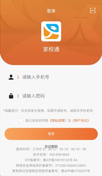 登录说明:登录账号是由学校提前预制到平台中的,通常情况下登录账号为学生监护人手机号码。