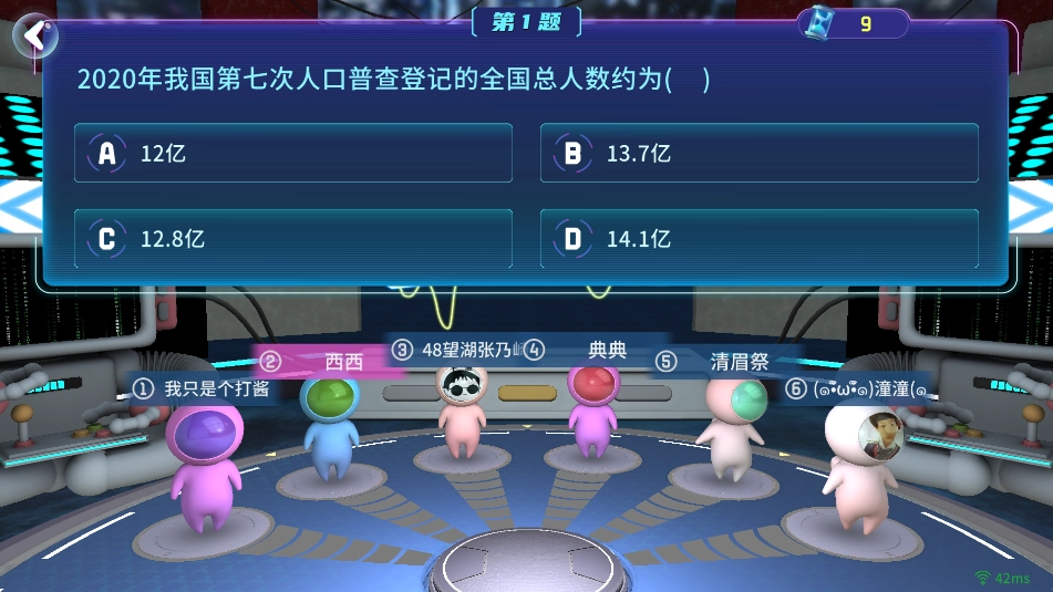 3、答题规则为6人组成一组,系统将给出5道题目,待所有题目回答完毕后,会公布组内每个人的排名情况。