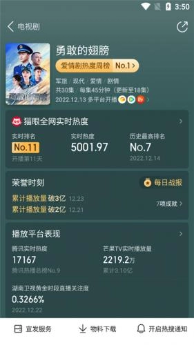 3、我们点击进入其中一个电视剧,里面为用户提供实时排名、实时热度、历史最高排名、累计播放、播放平台表现等等数据;