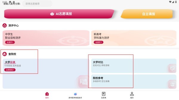 3、在【查院校】模块中,可借助【大学目录】功能浏览院校,也能通过【大学对比】功能对院校信息进行比对。