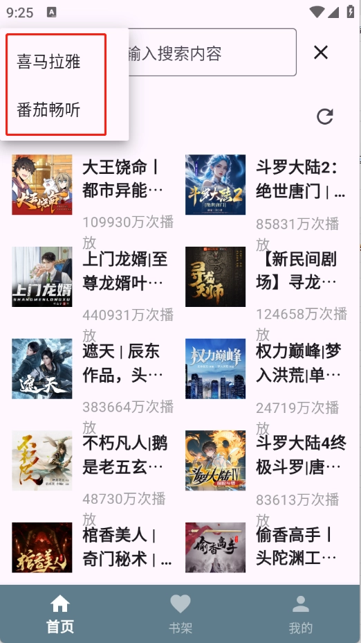 进入首页后,这里汇集了大量小说资源,左上角默认显示的是喜马拉雅书源,点击旁边的箭头就能切换书源。