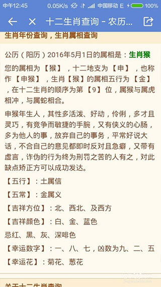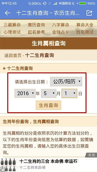 在常用工具中,点击生肖属相,进入查询界面;