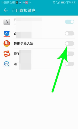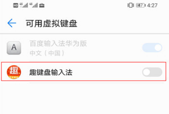 进入“可用虚拟键盘”界面后,找到“趣键盘输入法”,点击其右侧的灰色按钮,具体位置可参照下图。