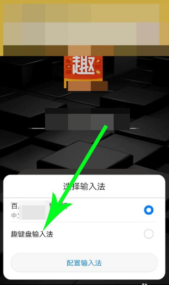 打开“选择输入法”弹窗后,点击“趣键盘输入法”右侧的圆形选择按钮,具体位置可参考下图。
