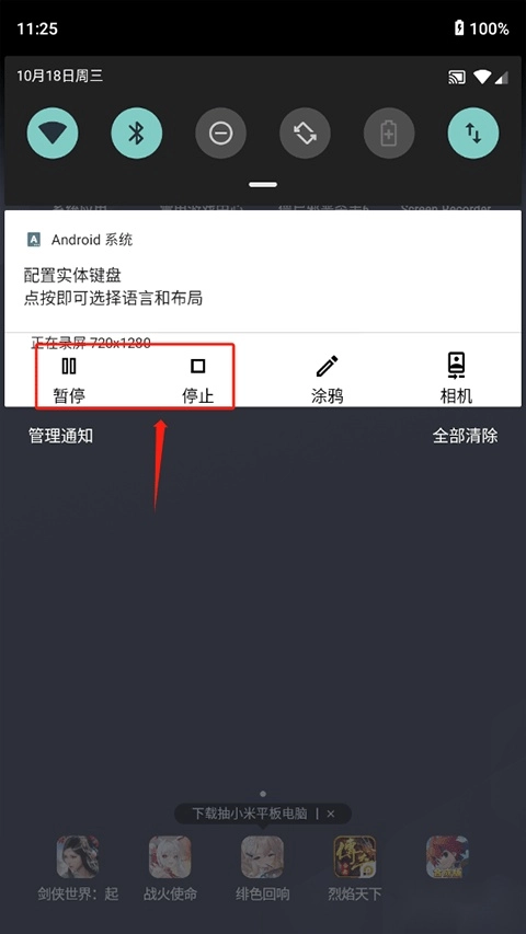 4、录制过程中,手机内部产生的任何声音都会被收录进去;录制结束后,下拉手机状态栏,点击停止按钮即可完成操作。