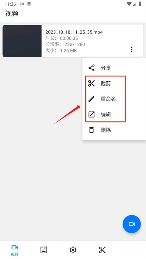 6、同时点击视频右侧的三点图标,还能对视频执行裁剪、编辑、重命名等操作。