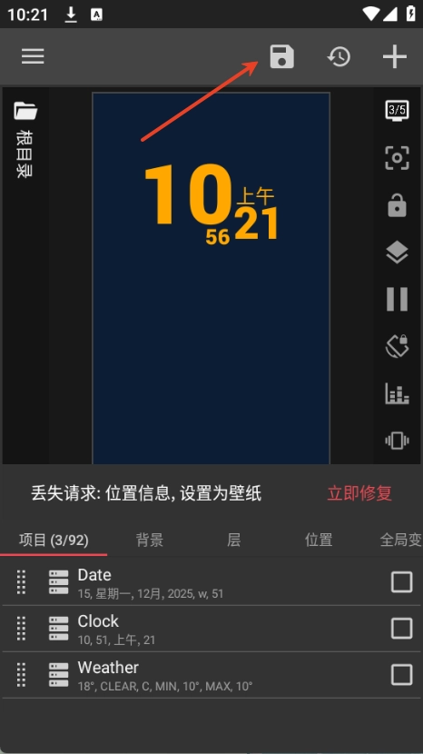 3、根据需求添加天气、电量等组件,完成触摸交互设置后,点击右上角的“保存”按钮即可结束操作。