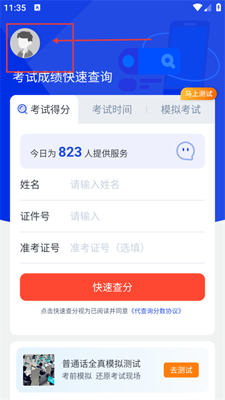 1、点击头像进入成绩查询页面,填写【姓名】【证件号】等相关信息后,点击【快速查分】按钮即可查看考试成绩。