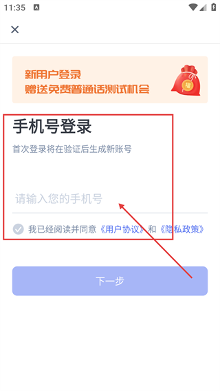 2、在【手机号登录】页面输入手机号并点击下一步,新用户能获得免费的普通话测试机会。
