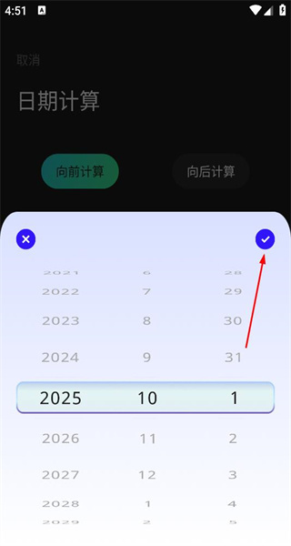 3、进入日期选择界面后,选定2025年10月1日作为起始时间,点击确认按钮即可回到日期计算页面。