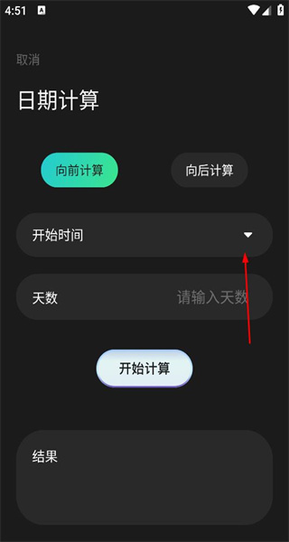 2、进入日期计算页面后,会看到“向前计算”和“向后计算”两个选项,接着点击开始时间对应的下拉按钮来选择日期。