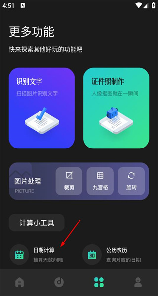 打开软件后,先进入更多功能页面,浏览识别文字、证件照制作等功能选项,接着点击日期计算功能,进入其对应的操作页面。