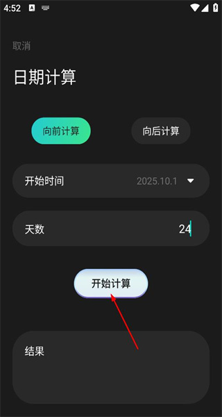 4、返回日期计算页面,输入天数24,点击开始计算按钮,得到相应的日期计算结果。