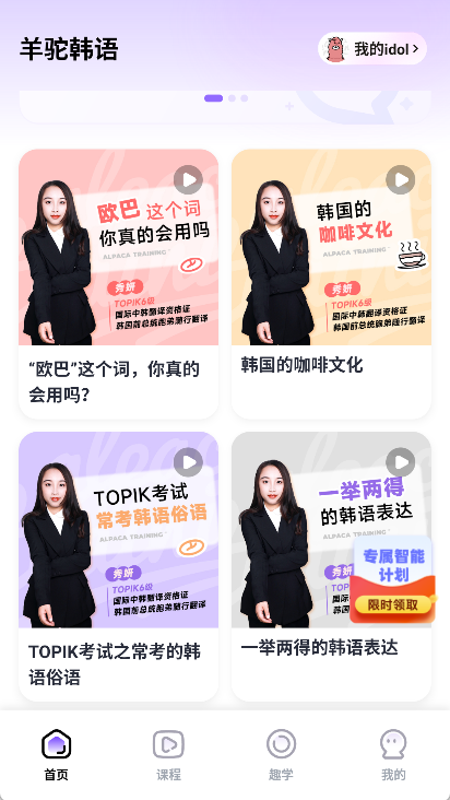 羊驼韩语是一款为韩语学习者量身定制的在线学习平台,这里汇聚了丰富多元的趣味学习内容。发音教学采用地道的韩语发音,学习功能覆盖全面,尤其适合零基础入门的用户。课程体系从核心的韩语四十音开始,循序渐进地延伸至口语训练和场景对话,助力用户实现稳步进阶。平台还配备了图文结合的词汇卡片与专业录音工具,让学习者在轻松愉悦的环境中高效掌握韩语知识。
