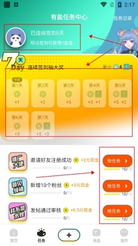 2、进入【任务】界面完成签到操作,连续签到满7天即可获得抽取大奖的机会。
