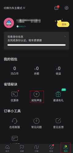 1、我们要在“我的”页面里点击“减免押金”按钮。