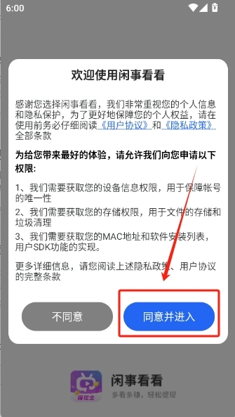 1、安装并打开闲事看看,选择“同意并进入”