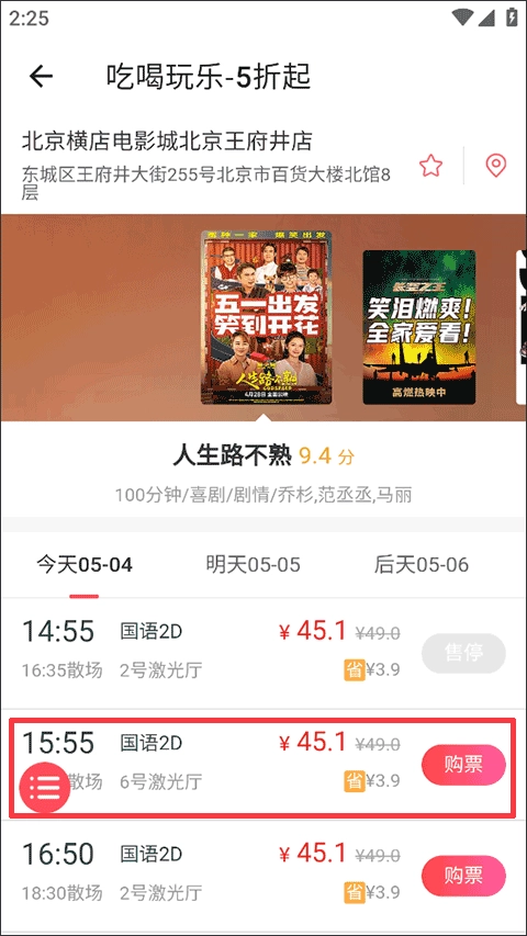 6、进入具体的电影院界面后,选择合适的观影时间段,点击购票按钮完成购买操作。