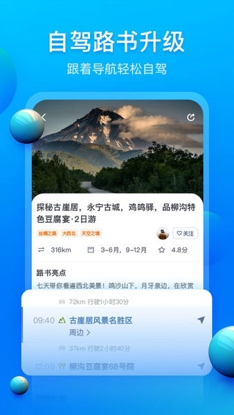 1、这款软件在推荐自驾游目的地时,不仅涵盖热门景点,还会兼顾对山水风光、人文景观与古村落的挖掘探索;