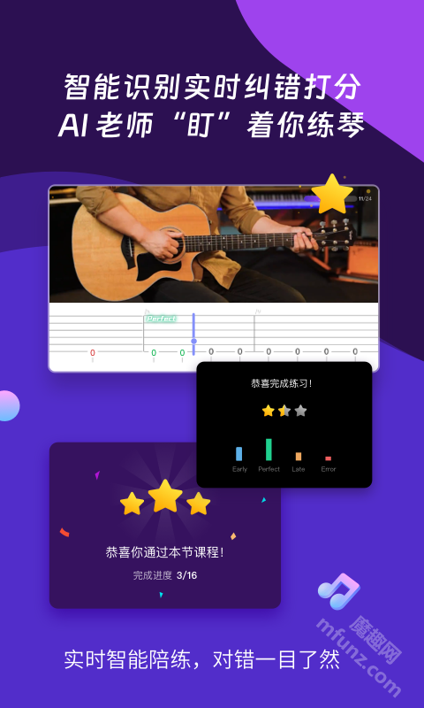 4、学习辅助工具:借助调音器、节拍器、和弦库等各类学习辅助工具,助力用户更有效地学习并熟练掌握乐器演奏技巧。
