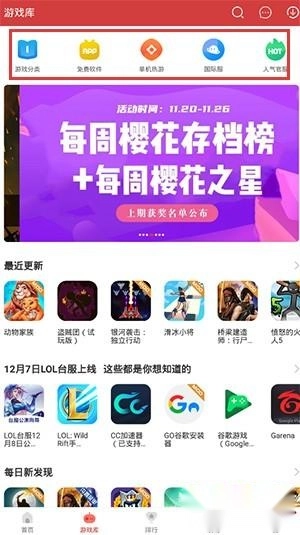 3、打开游戏库,这里有游戏分类、免费软件、单机热游、国际服等各类游戏推荐;